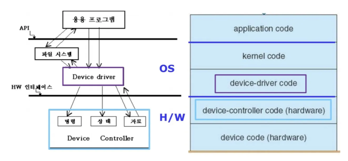- Device Driver : Device Driver는 운영체제와 하드웨어 장치 간의 인터페이스 역할다양한 하드웨어 입출력 장치를 제어하기 위해 각 입출력 장치에 맞는 드라이버가 필요하므로 존재한다.