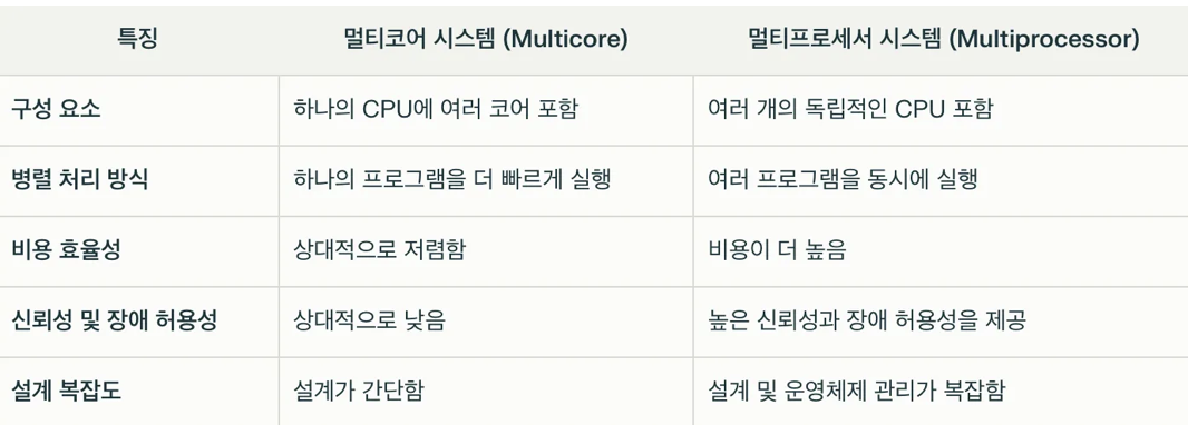 📎 Term - CPU : 명령어들을 실행하는 하드웨어 - Processor(처리기) : 하나 이상의 CPU를 포함하는 물리적인 칩 - Core : CPU의 기본 연산 단위 (코어는 명령어를 실행하고 데이터를 저장하기 위한 레지스터를 포함하는 구성 요소) - 다중 코어(Multicore): 동일한 CPU에 여러 개의 코어 포함 - 다중 처리기(Multi-Processor): 여러 프로세서를 포함