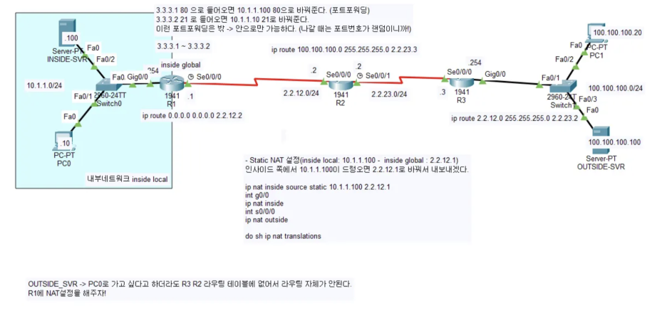 ip nat inside source static tcp 10.1.1.100 80 3.3.3.1 8888 (포트포워딩)